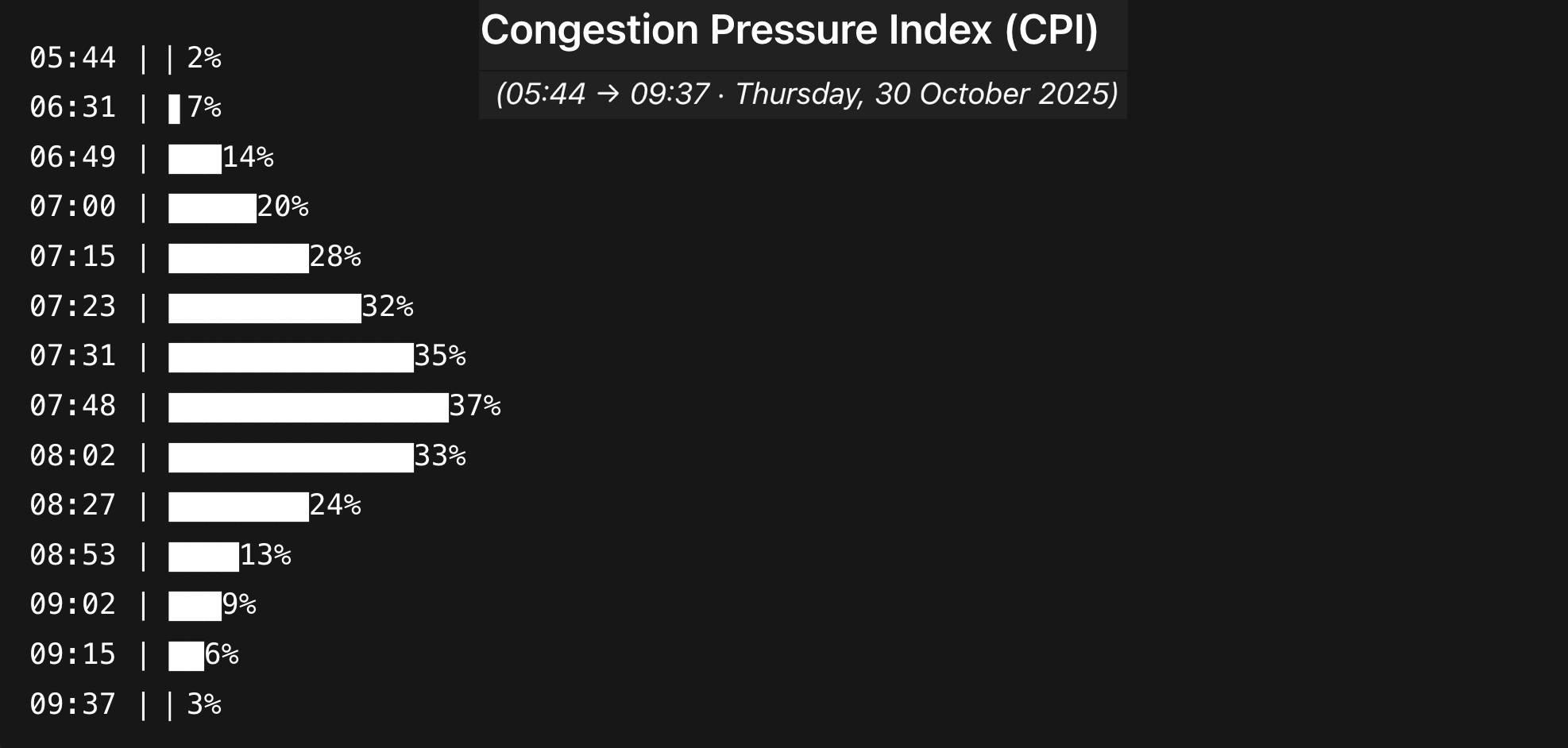 Let’s look at Thursday, 30th October 2025’s Congestion Pressure Index (CPI) and 15 traffic delays’ snapshots: