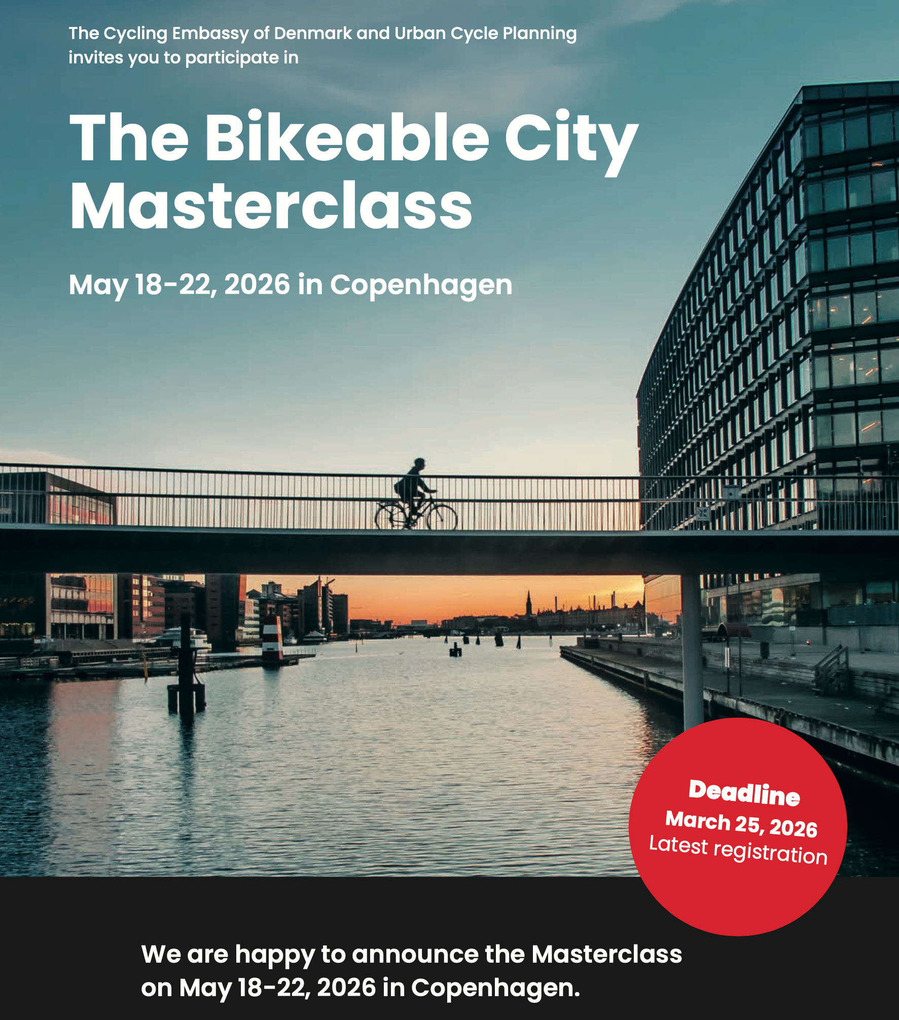 Now consider the third announcement: from 18th-22nd May 2026, urban planners + decision-makers + advocates will gather in Copenhagen for the Bikeable City Masterclass, led by the internationally respected architect Lotte Bech together with experts from the Danish cycling planning ecosystem, including specialists shaped by the legacy of urbanist Jan Gehl.