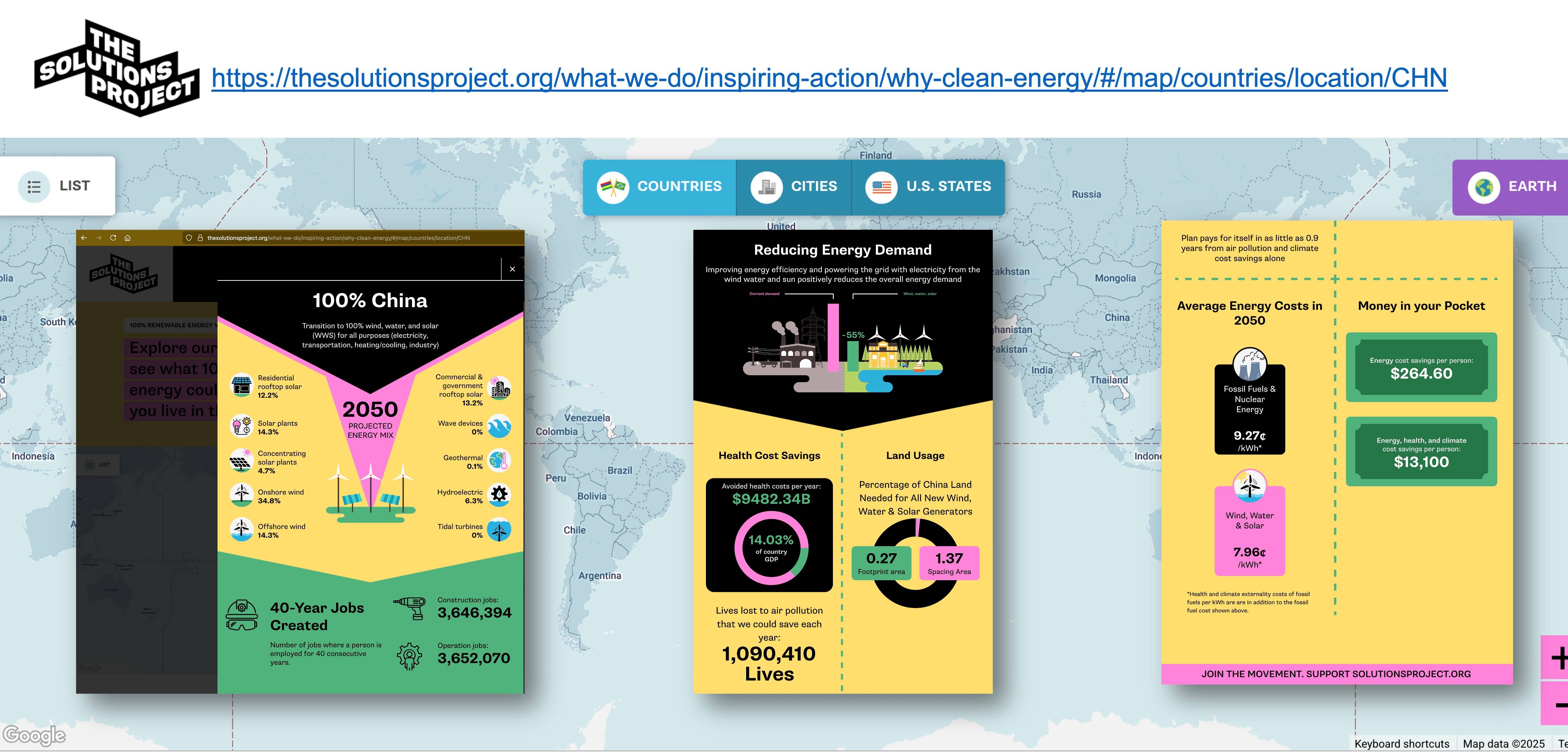 The data show how powerful that redirection could be. A full transition of China to 100 percent wind, water, and solar by 2050 would create more than seven million long-term jobs in construction and operations. It would save over one million lives every year from air-pollution deaths. It would avoid nearly ten trillion dollars in health costs annually. And it would deliver less costly power . . . with renewables costing less per kilowatt-hour than the combined fossil and nuclear system they replace. Every person in China would stand to gain many thousands of dollars a year in combined energy, health, and climate savings.