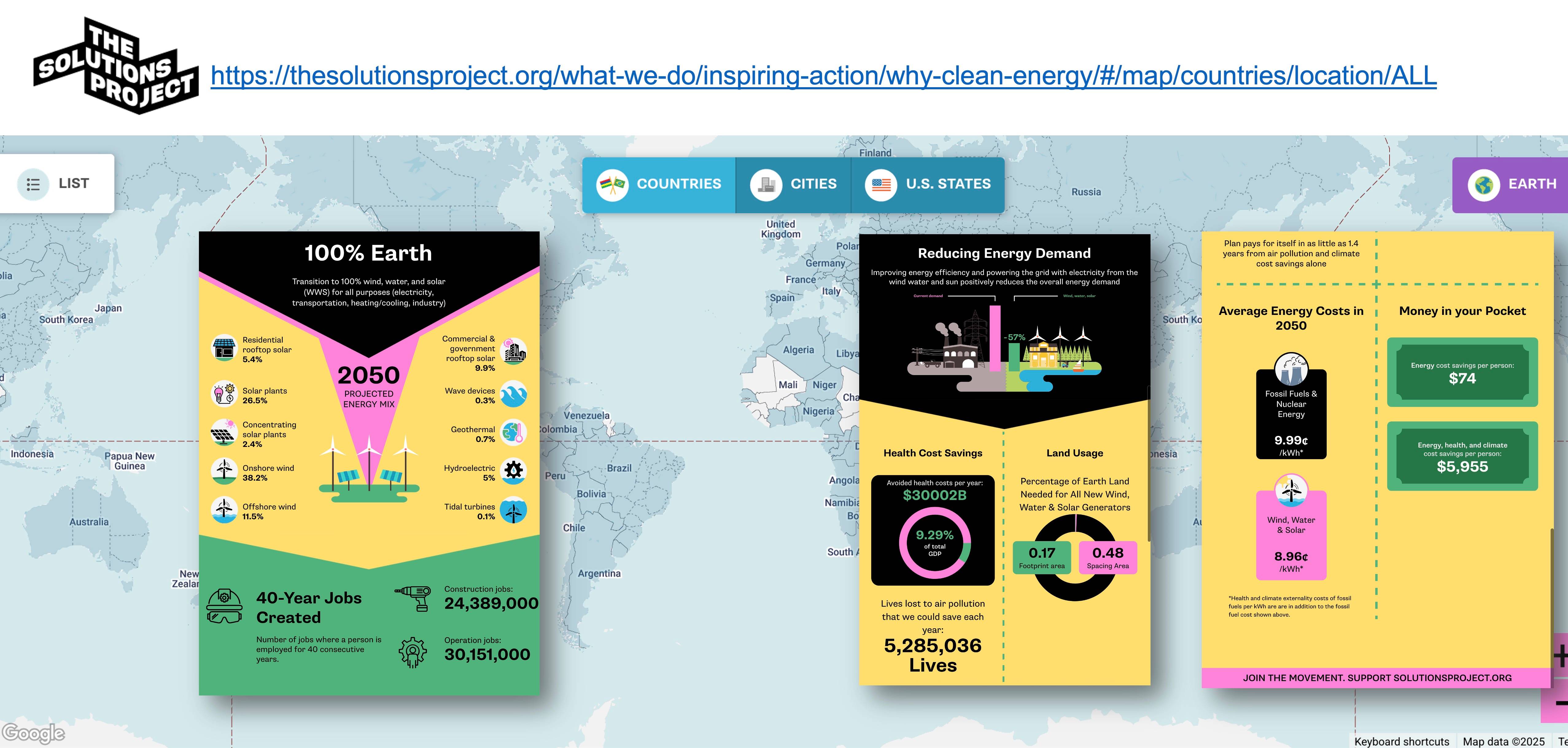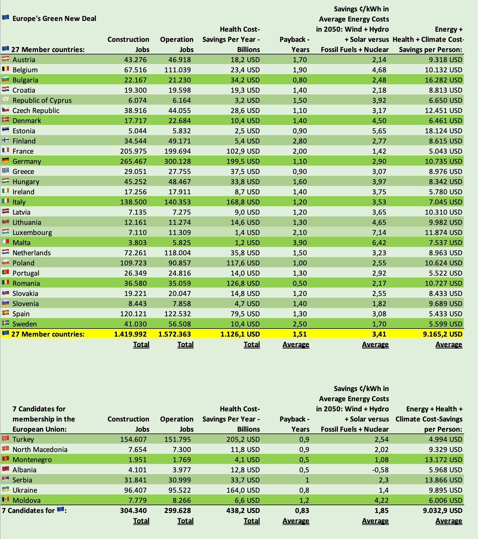 Europe’s picture is even more striking when we look at the whole European Union rather than country by country. I recently harvested the numbers for all twenty-seven EU member states from The Solutions Project and assembled them into a single table. Together, a 100 percent WWS transition across the Union would create more than 1.4 million long-term construction jobs plus nearly 1.6 million operations jobs. It would save more than 1.1 trillion dollars every year in health costs. On average, the payback time? One year-and-a-half. Wind, water, and solar would be more than three cents per kilowatt-hour cheaper than fossil fuels and nuclear. And when we combine energy, health, and climate benefits: on average, every person in the European Union would save more than nine thousand dollars a year.
