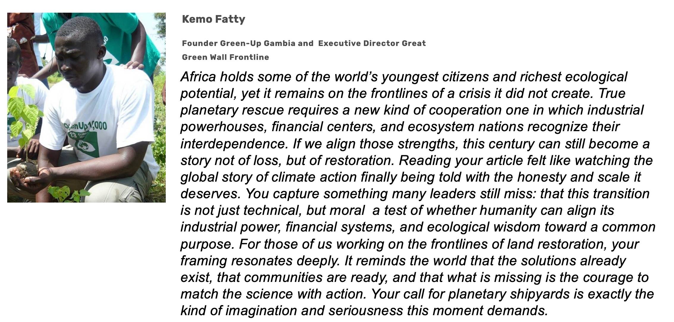 Not the false shipyards of geoengineering schemes, carbon-capture fantasies, or nuclear mega-projects that will devour decades we do not have. The only shipyards that matter now are the ones that rebuild life at scale. Renewable energy deployed with wartime coordination. Forests and Coral Reefs restored with the precision of supply chains. Oceans regenerated with the urgency of infrastructure. Permaculture elevated from garden philosophy to planetary engineering.