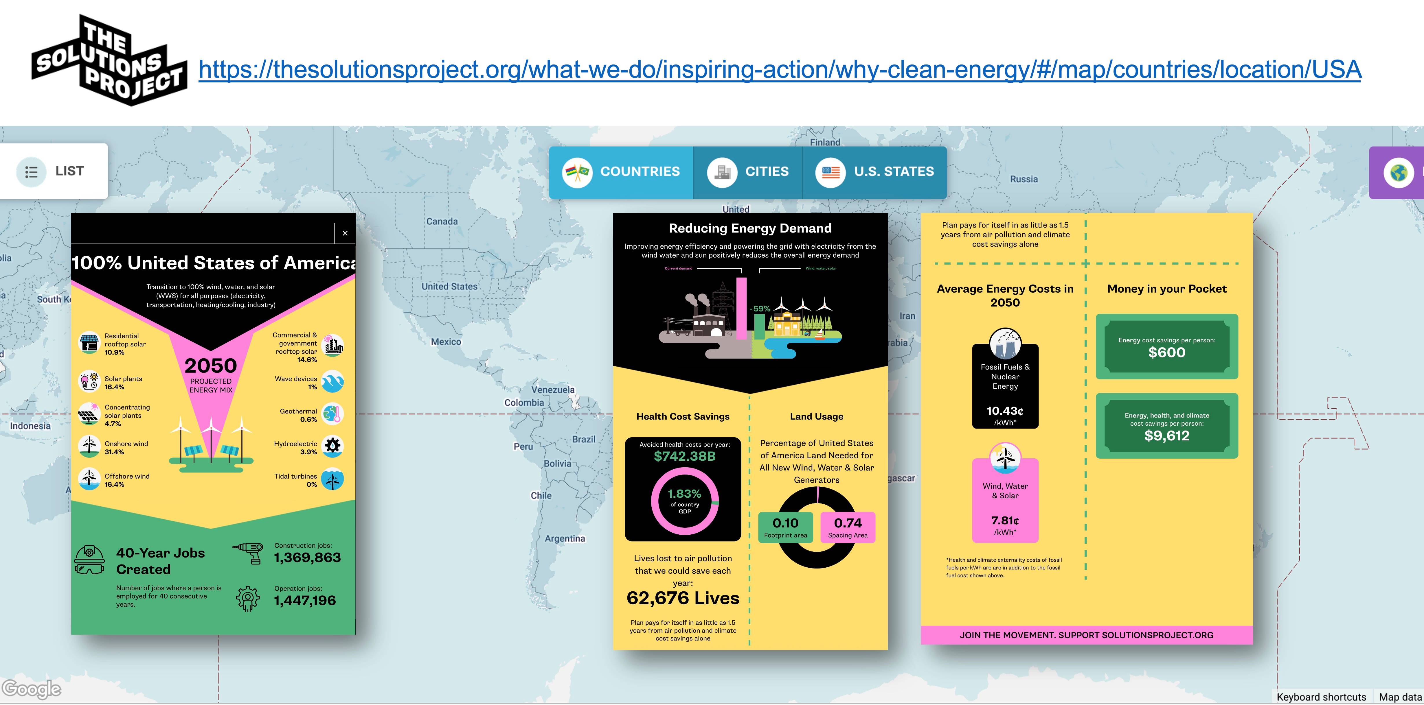 Take the United States: a transition to 100 percent wind, water, and solar by 2050 is estimated to create around 2.8 million long-term jobs. It would save more than sixty thousand American lives every year from air-pollution deaths. It would avoid more than seven hundred billion dollars per year in health costs. Renewable electricity would be cheaper than today’s mix of fossil fuels and nuclear power, and every person in the country would save hundreds of dollars a year on energy bills and roughly ten thousand dollars a year when health and climate damages are counted.