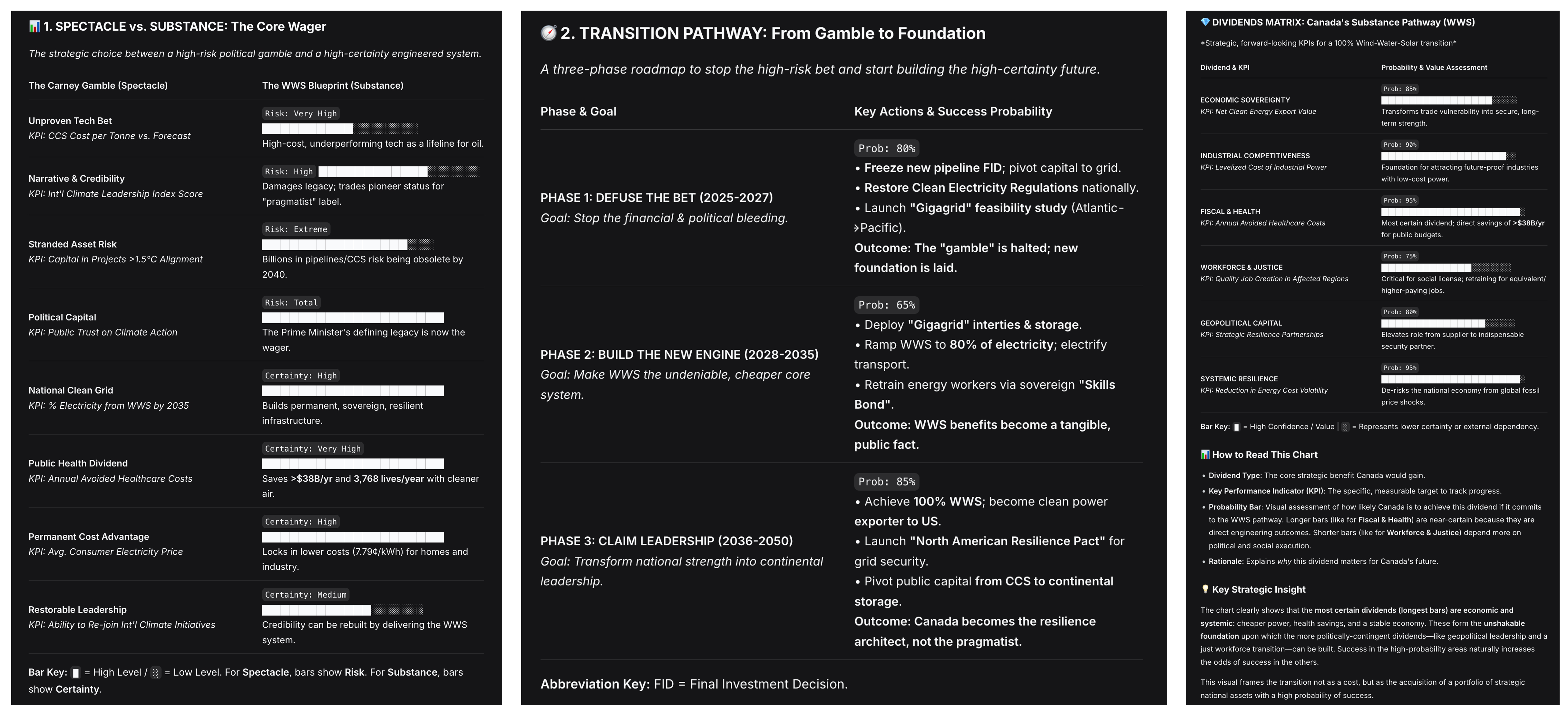 PHASE 3: CLAIM LEADERSHIP (2036-2050): Probability of Success: 85%. Goal: Transform national strength into continental resilience leadership. Actions: Achieve 100% WWS; become a clean power exporter to the U.S.; launch a “North American Resilience Pact” for grid security. By this phase, the economic and technical advantages become self-evident and politically unassailable.