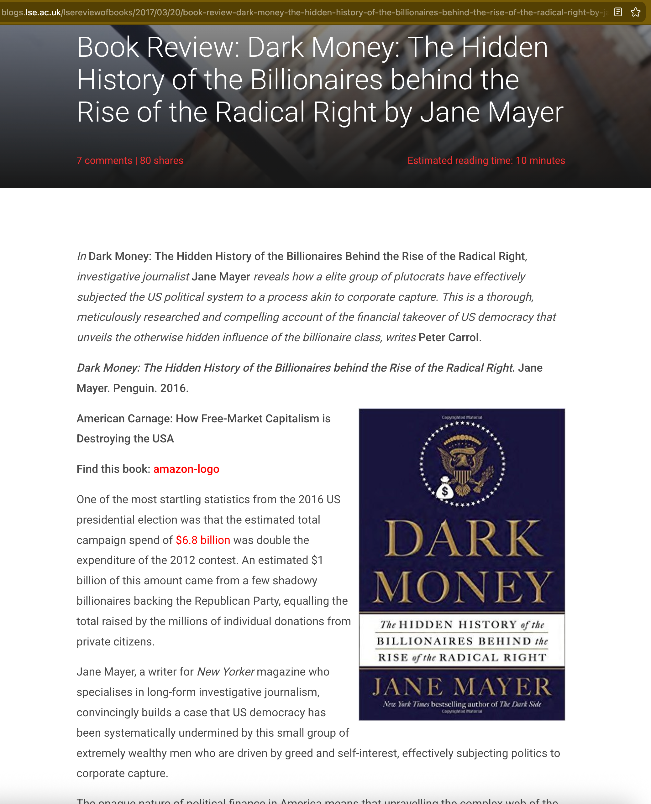 - Dark Money: The Hidden History of the Billionaires Behind the Rise of the Radical Right is a 2016 non-fiction book written by American investigative journalist Jane Mayer https://blogs.lse.ac.uk/lsereviewofbooks/2017/03/20/book-review-dark-money-the-hidden-history-of-the-billionaires-behind-the-rise-of-the-radical-right-by-jane-mayer/