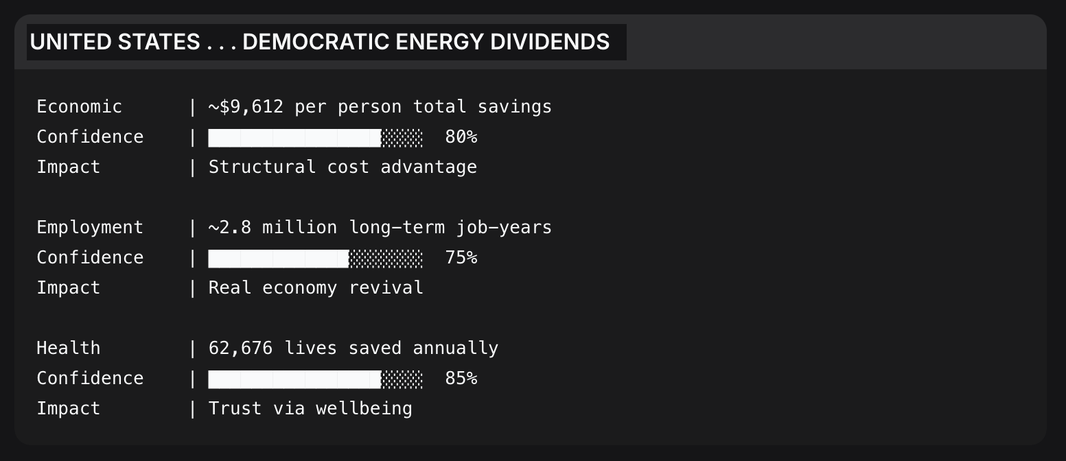 What makes our moment different is not virtue. It is capacity. For the first time, the material basis of the old excuse . . . that “there is no alternative” . . . has collapsed. The Solutions Project’s roadmaps prove that wind, water, solar plus battery-storage can power entire societies. This turns a moral imperative into an engineering and economic choice. The dividends are no longer speculative; they are quantified, country by country.