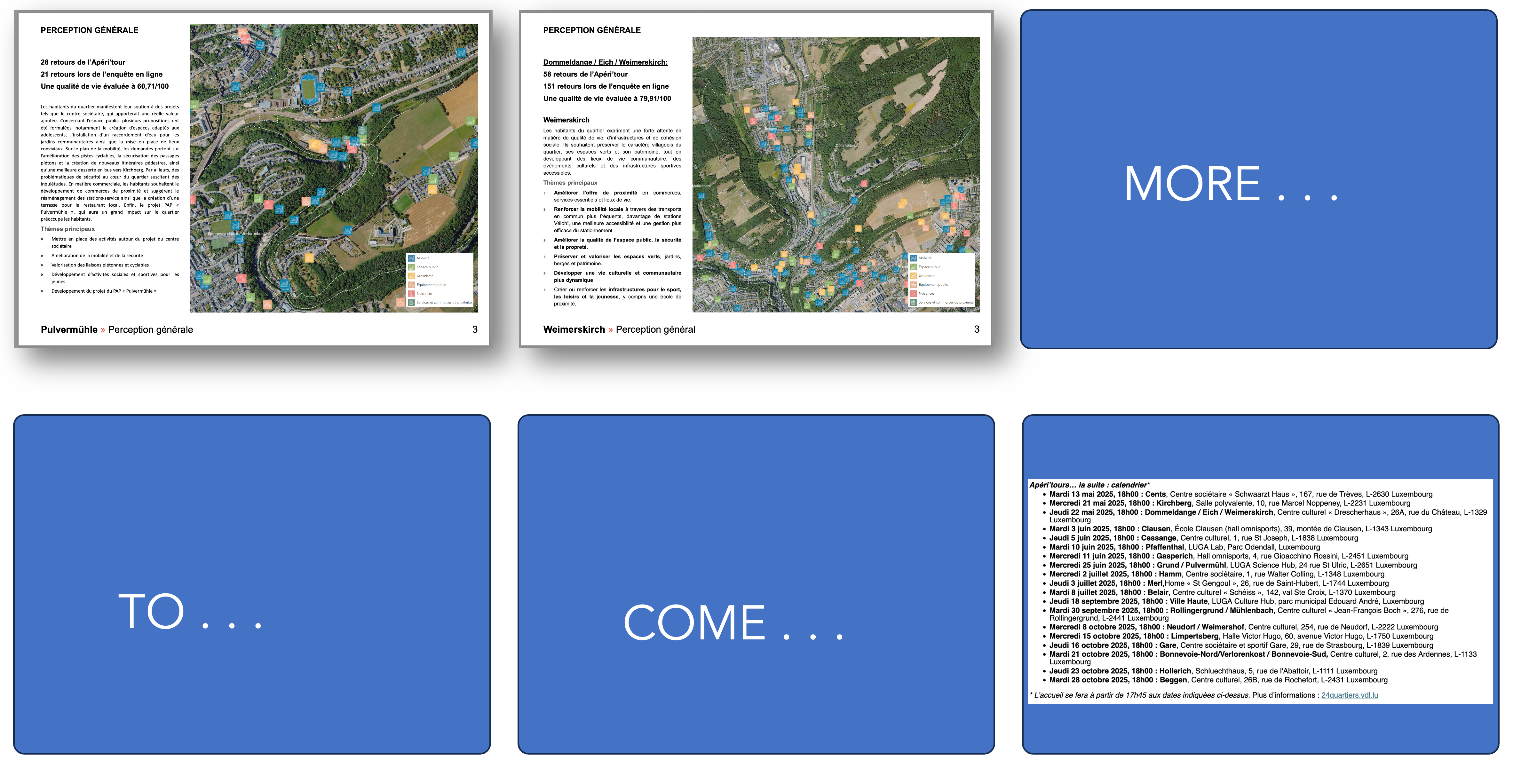 - Dommeldange / Eich / Weimerskirch – Jeudi, 22 mai 2025 – 18h – Centre culturel « Drescherhaus », 26A, rue du Château, L-1329 Luxembourg – PDF Evaluation quantitative par quartier 🇫🇷 français https://www.vdl.lu/sites/default/files/media/ni/document/DOMMELDANGE%20-%20Rapport.pdf
