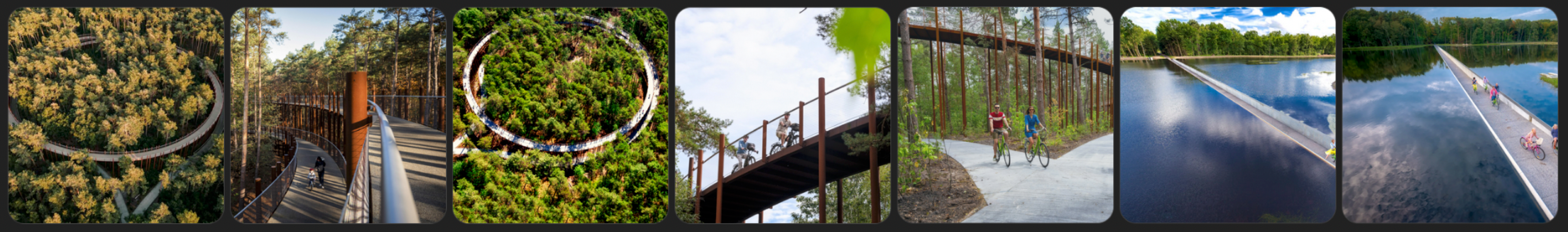 - Limburg, Belgium: tree-top cycling paths and lake-crossing cycling path in Boslun Forest combine tourism, ecology, and mobility https://www.visitlimburg.be/en/cycling-through-the-trees