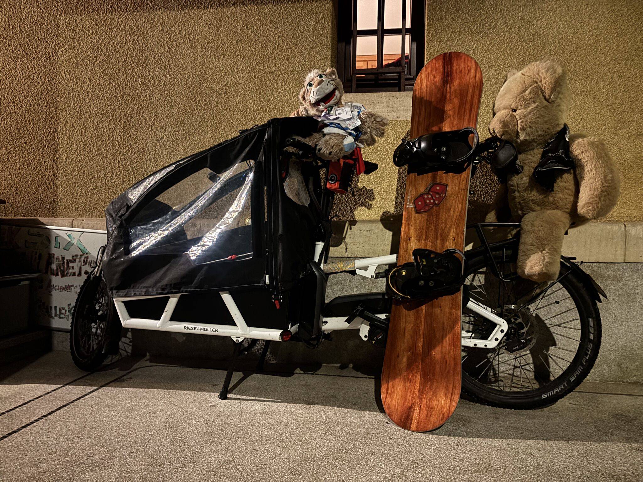In the cargo-box of my Riese & Müller Load75 sat two unlikely passengers: a giant stuffed grizzly teddy-bear and Youth4planet’s Climate Action Tiger.