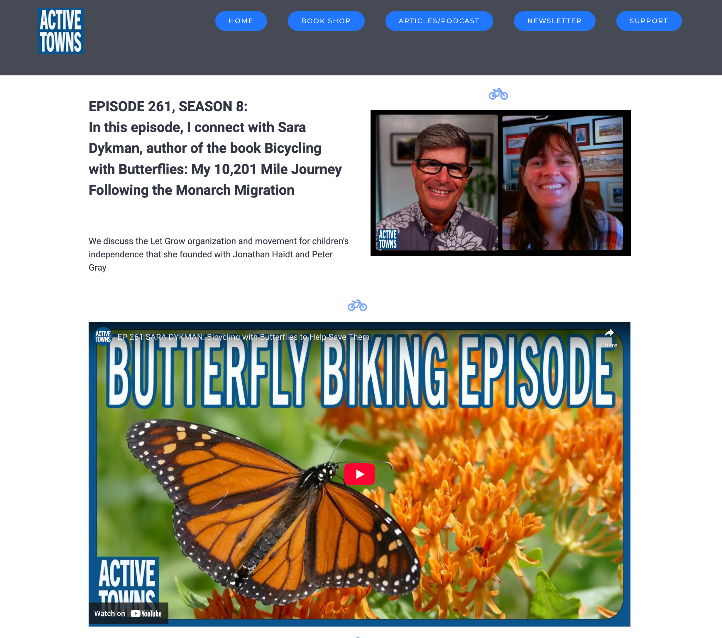 Bicycling with Butterflies – Active Towns episode 261 (season 8): https://www.activetowns.org/2024/09/19/bicycling-with-butterflies/
